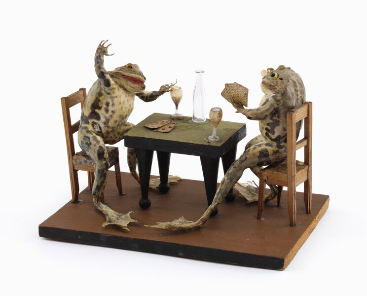 Victorians, who were kind of into death if you hadn’t noticed from the cemetery picnics, developed an interest in anthropomorphic taxidermy. Never heard of it? This is the art of positioning dead animals into human poses. Scenes included ice skating hedgehogs, dueling dormice, kittens attending a wedding, and a classroom of rabbits. Queen Victoria described these tableaus as “really marvelous.”